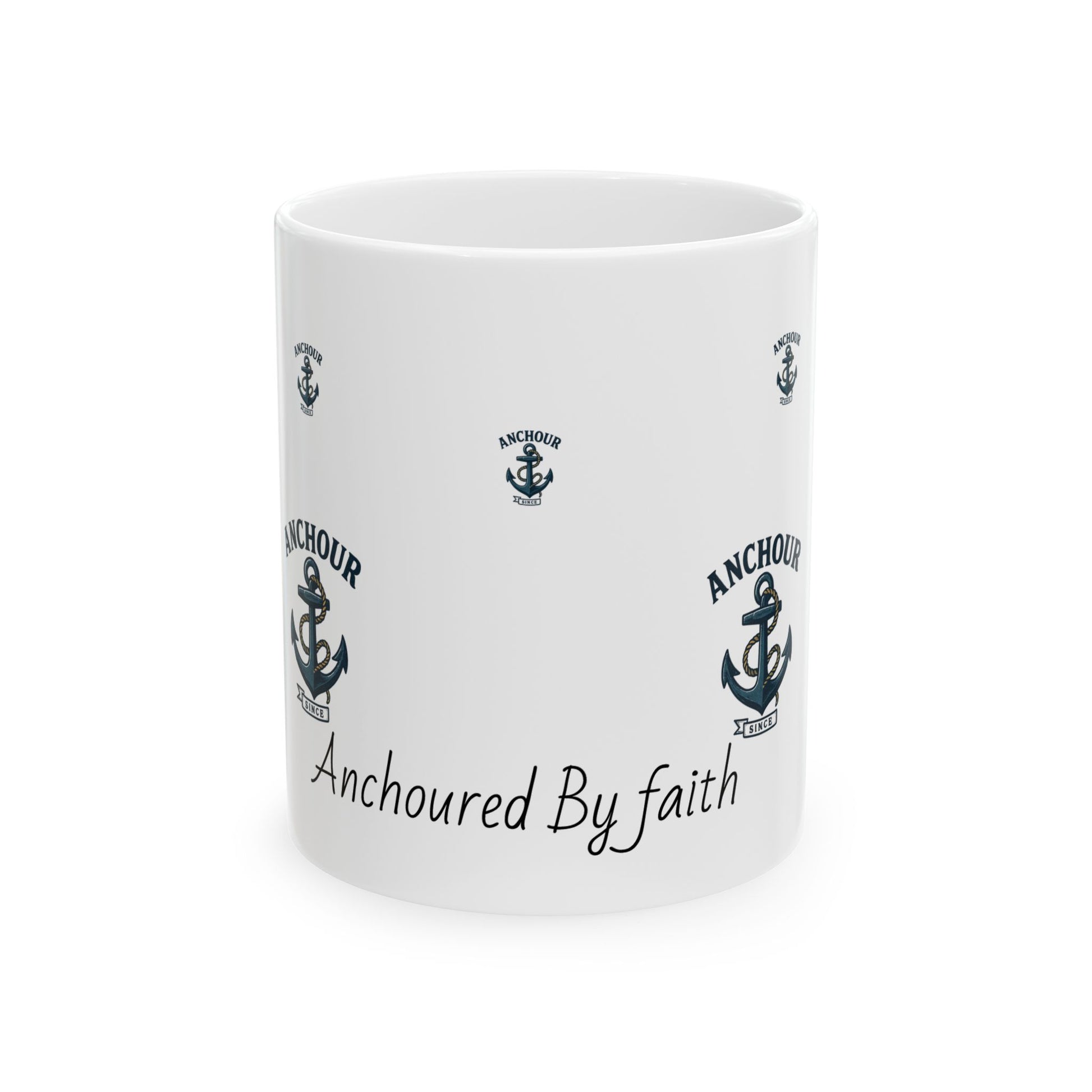 A calm, faith-forward mug that brings a sense of steadiness to your morning ritual. Clean white ceramic wraps a repeating navy anchor emblem and the gentle script “Anchour Your faith,” turning coffee or tea into a quiet reminder to steady your heart. The glossy finish makes the navy artwork pop while the comfortable C-handle feels familiar in hand. Use it at the kitchen table, on a cluttered desk, or set it on the boat’s stern. This mug holds a warm drink and a small moment of reassurance.