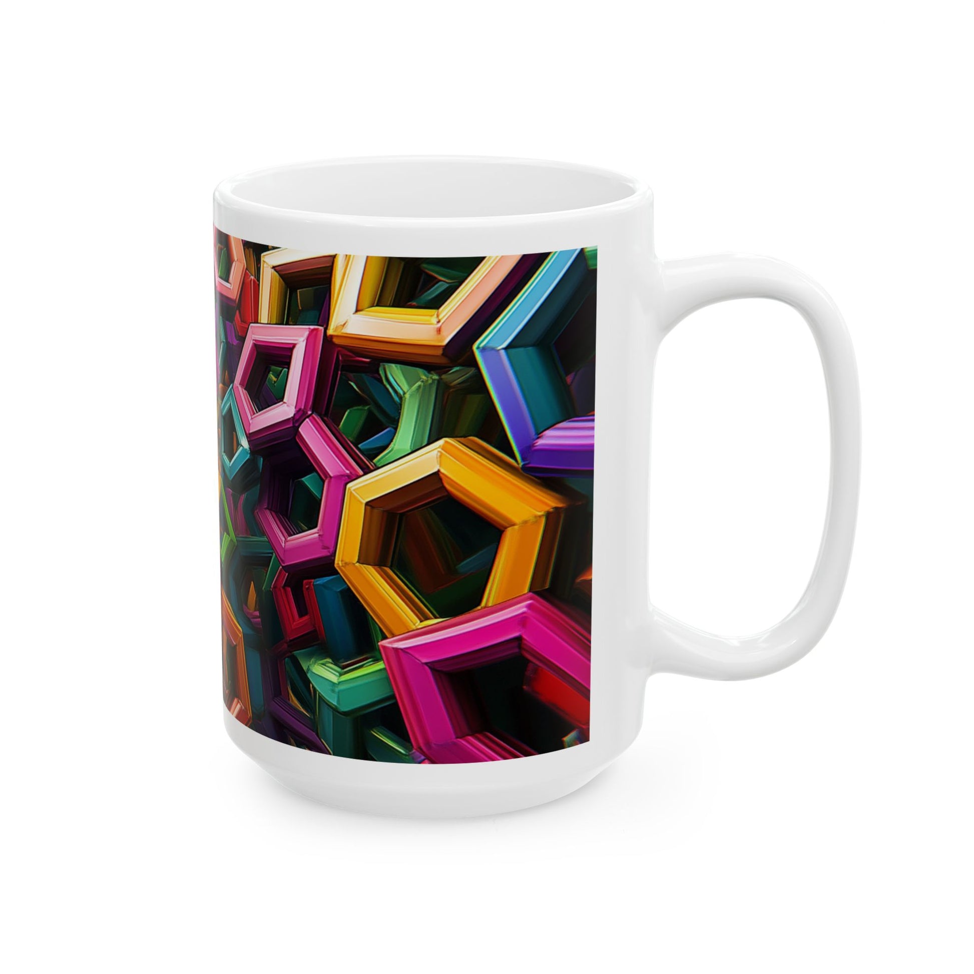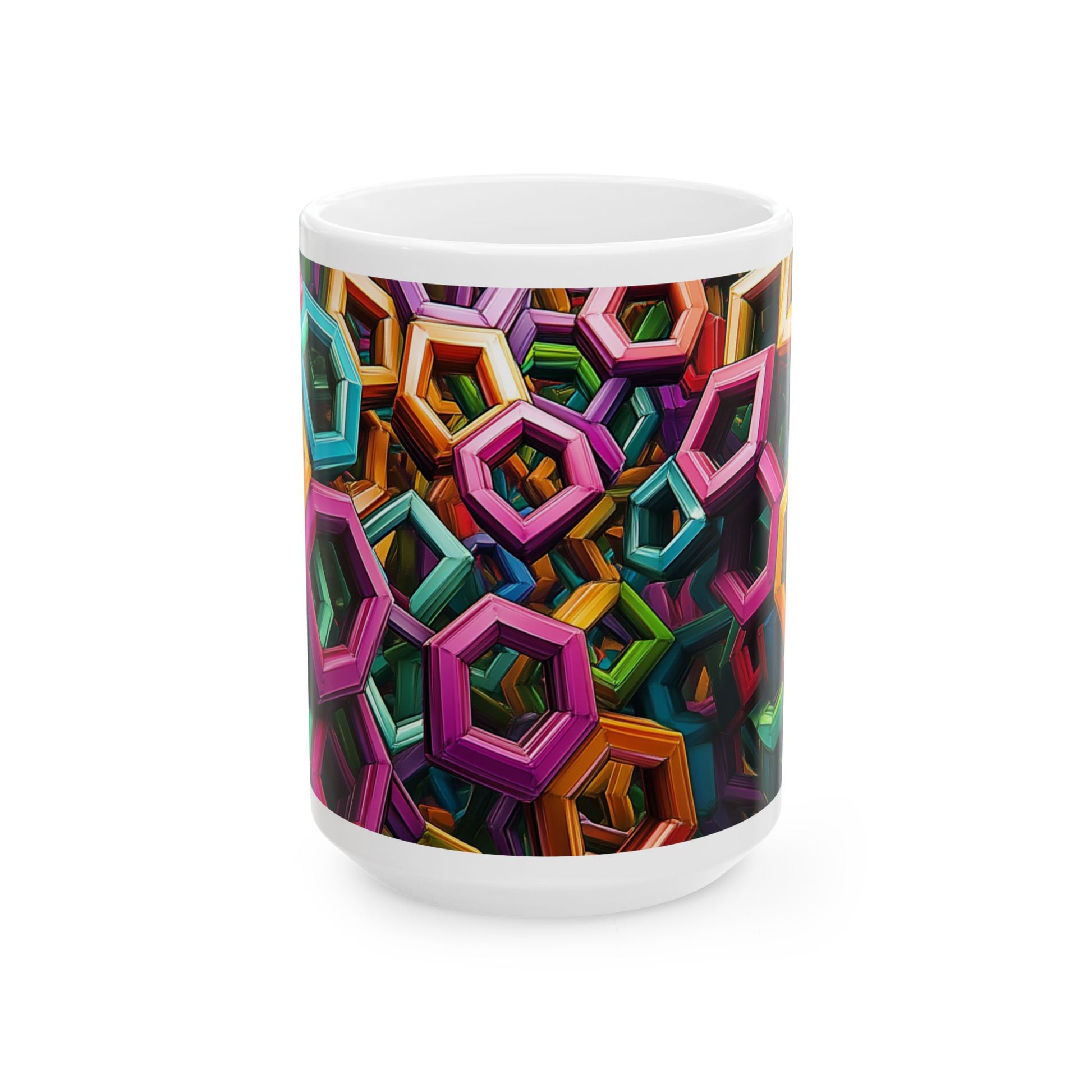 Colourful Hexagon Pattern Ceramic Mug that adds a pop of colour to your morning routine. Perfect for coffee or tea lovers looking to brighten up their day. Ideal for gifting on birthdays, housewarmings, or holidays like Christmas or Mother's Day.