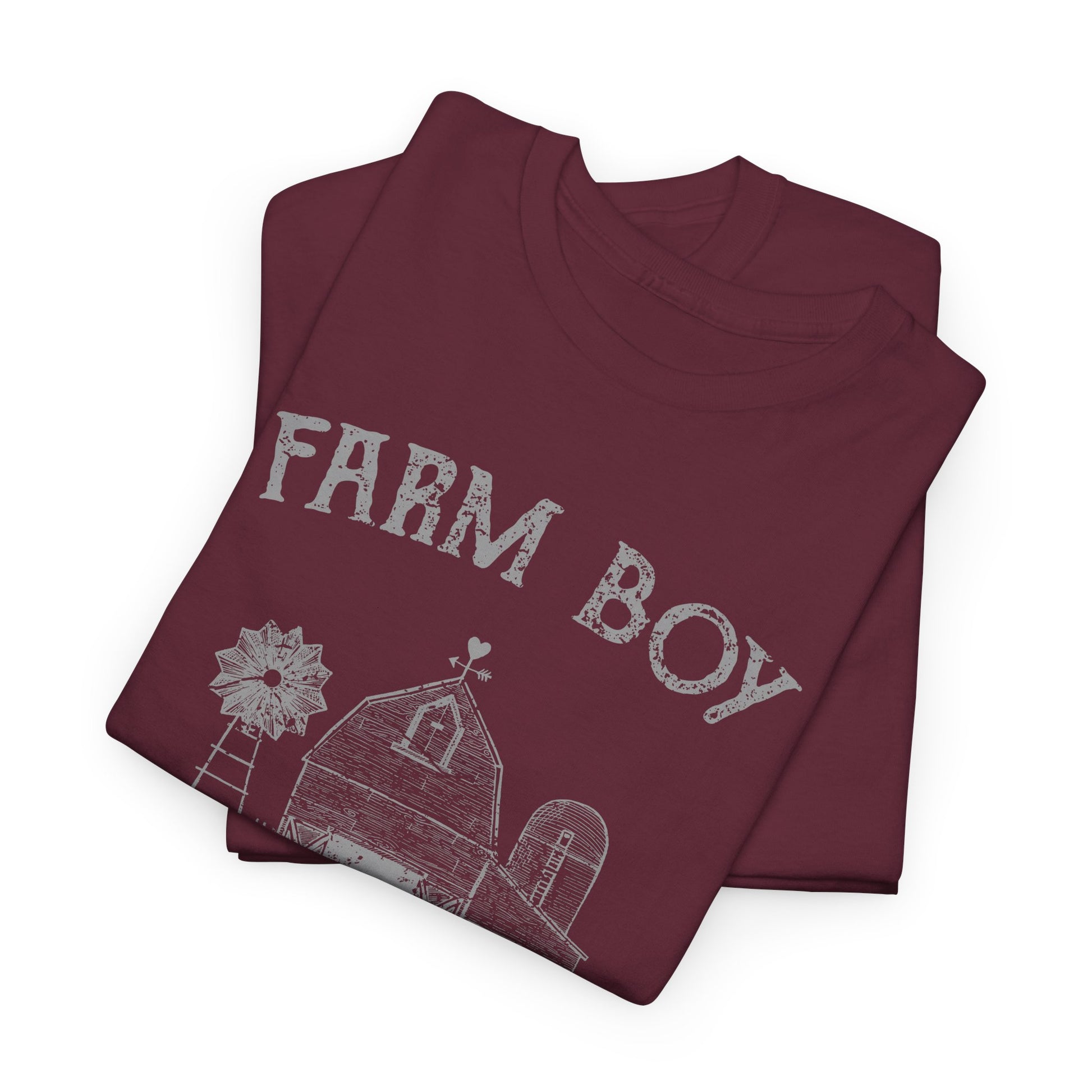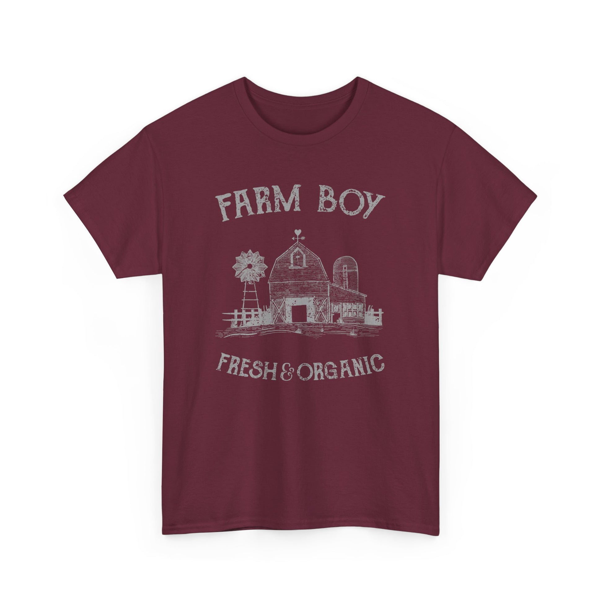 Farm Boy Organic Heavy Cotton Tee in bright yellow and burgundy, perfect for anyone looking for a comfy, durable shirt. The classic fit and timeless design make it versatile for various occasions, from casual outings to semi-formal events. Ideal for adults looking for sustainable and ethically produced clothing. Perfect for occasions like farm-themed parties, outdoor festivals, and everyday wear.