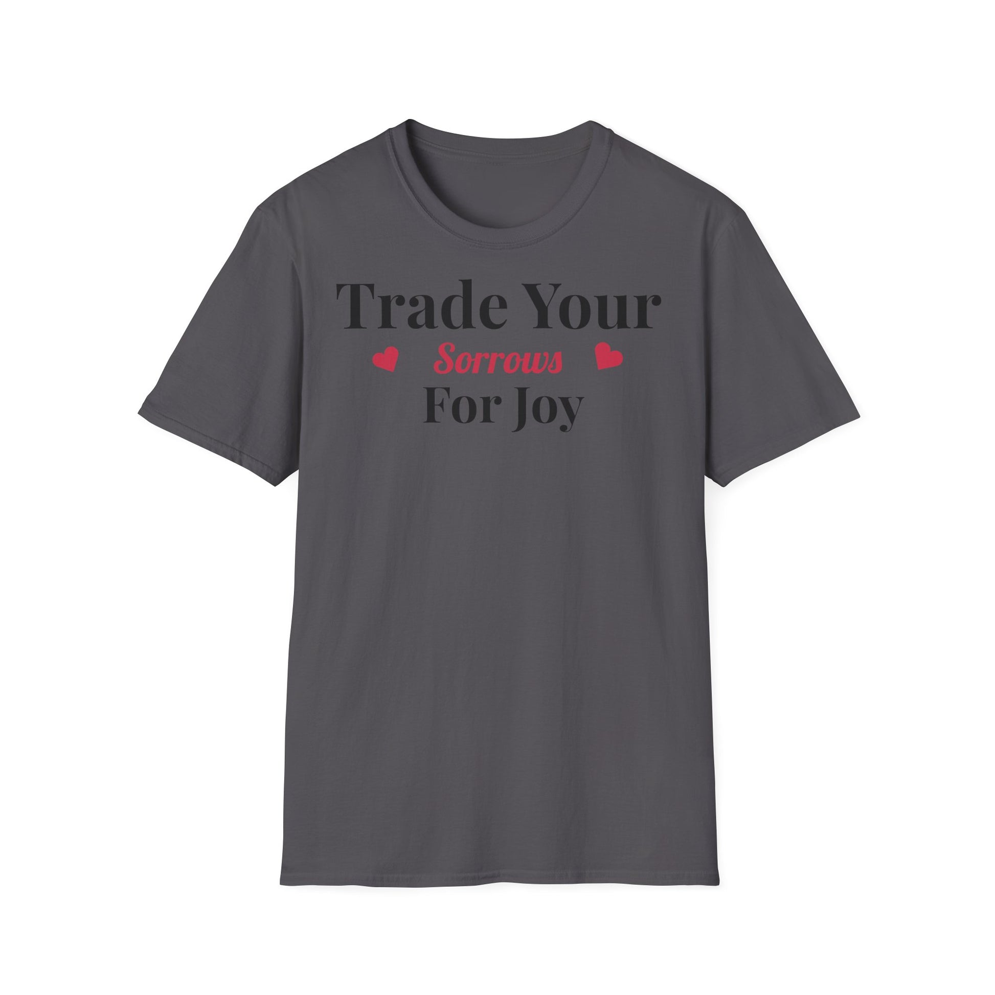 An inspirational unisex soft style T-shirt with the message 'Trade Your Sorrows for Joy'. Perfect for those seeking positivity and motivation in their everyday life. Ideal for adults looking for a comfortable and durable tee to wear on various occasions.