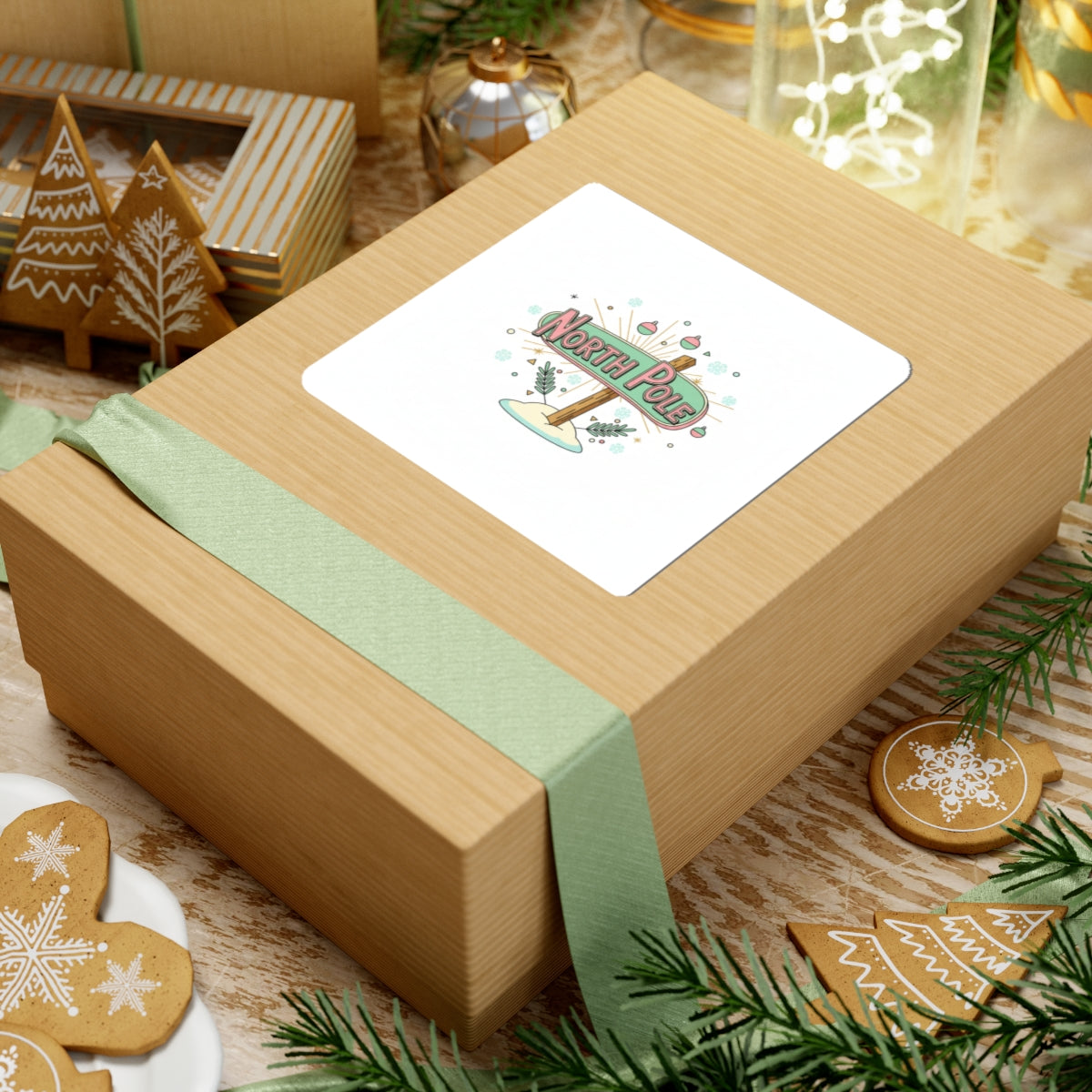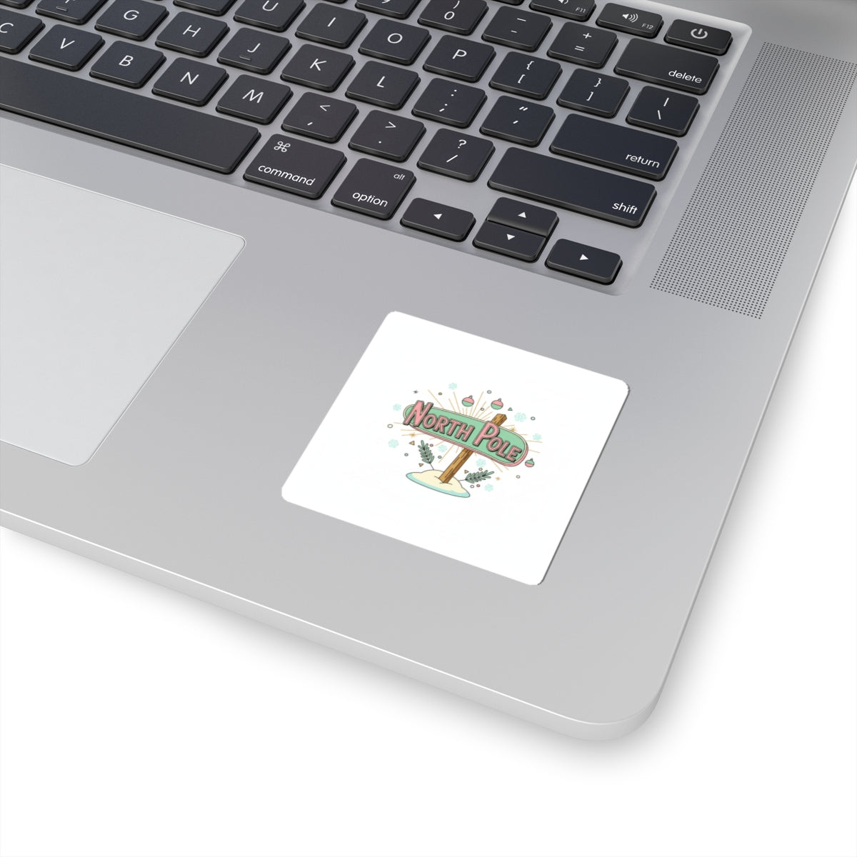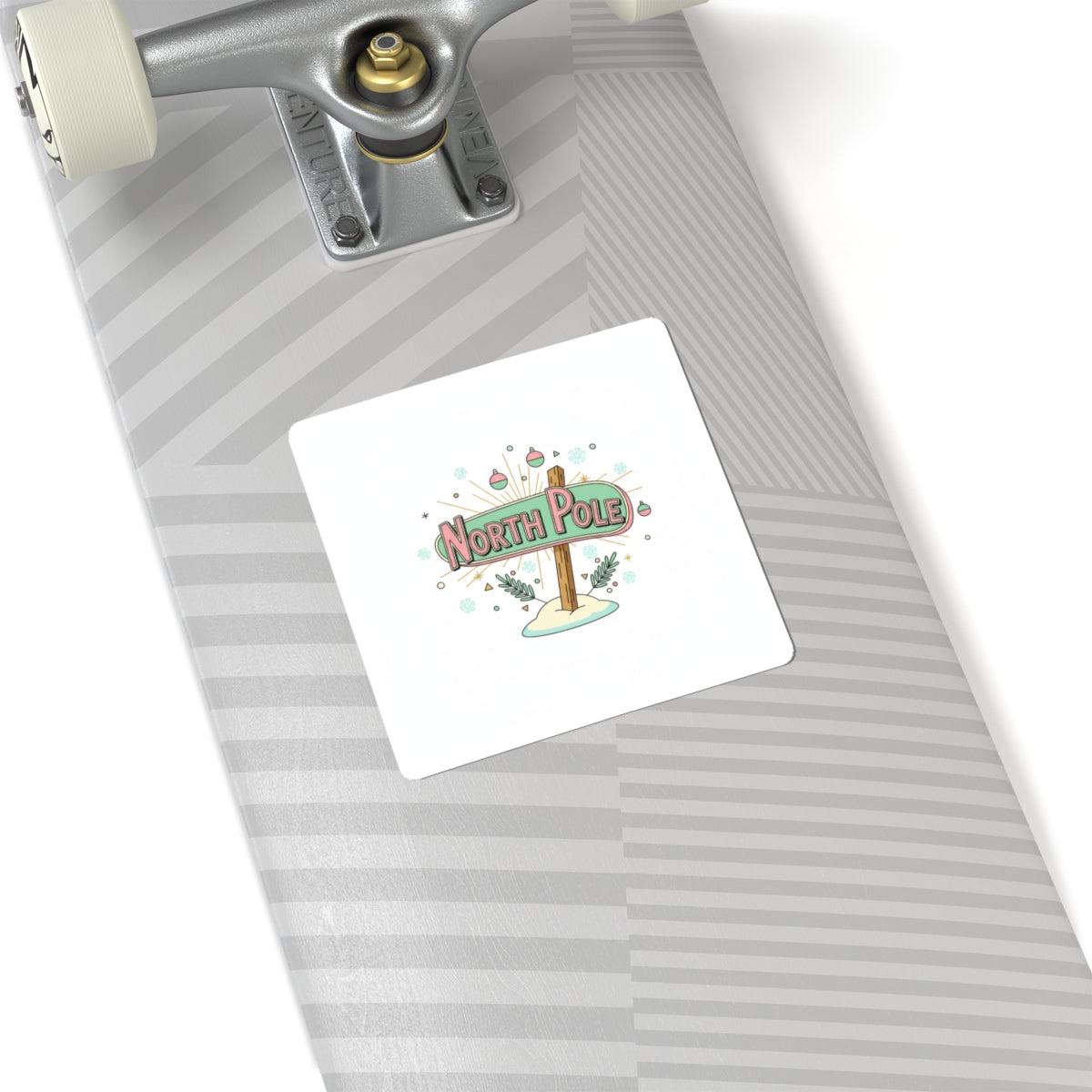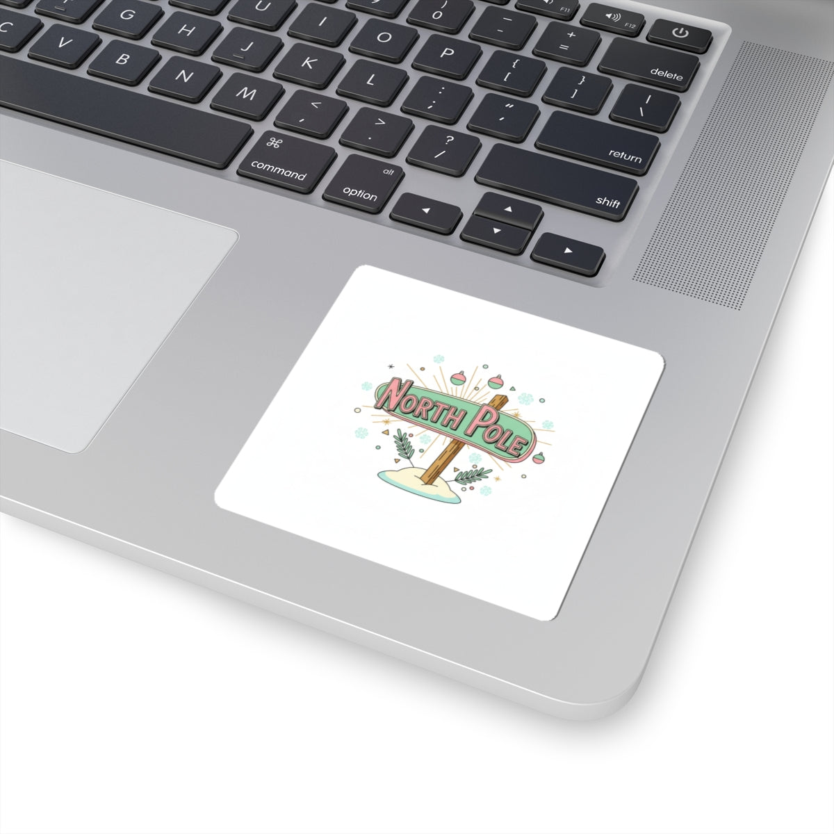 Retro-inspired North Pole sign sticker in a pastel mid-century holiday palette. The design features a stylized wooden signpost with period-evocative space-age lettering, starburst accents, and hanging ornament motifs that read as a kitschy 1950s travel sign. Its tidy, optimistic vibe fits into mid century Christmas and atomic age holiday aesthetics—great for shoppers hunting for retro holiday sign-style stickers to add a nostalgic touch to laptops, journals, or seasonal decor.