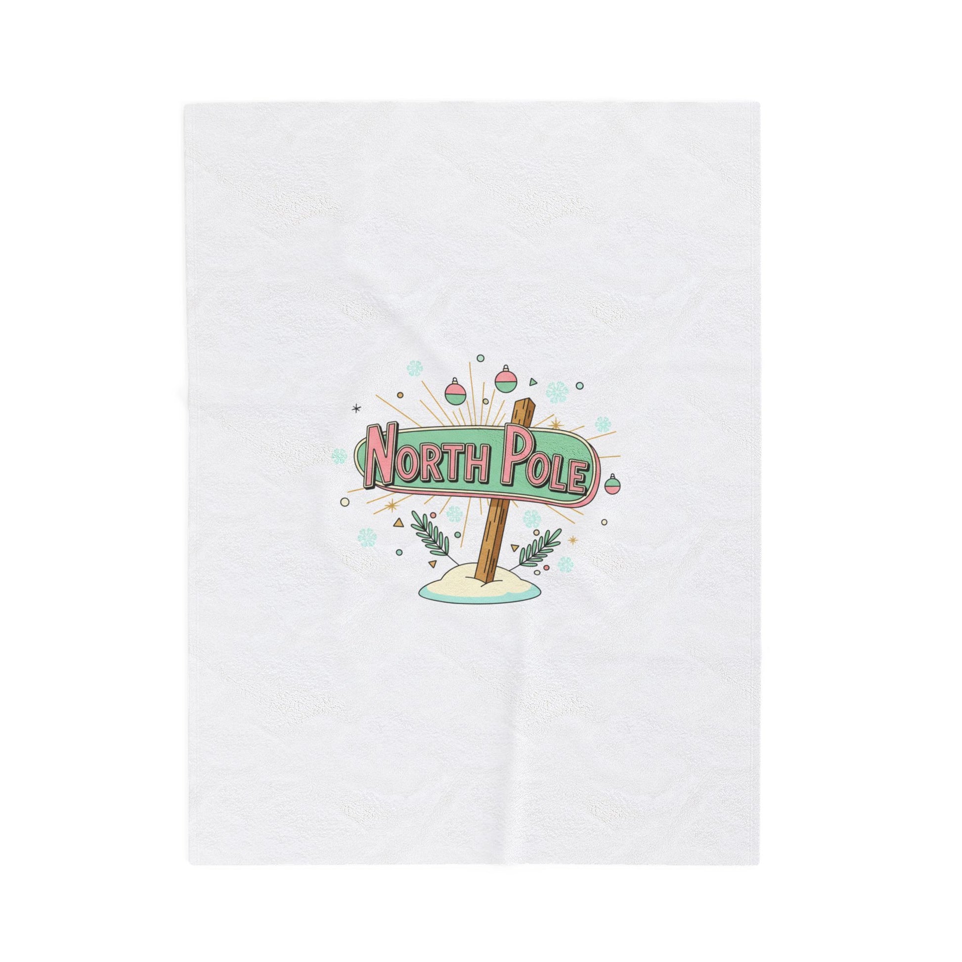 Playful mid-century Christmas velveteen blanket featuring a retro roadside “North Pole” sign illustrated with atomic starbursts, pastel ornaments, and tidy 1950s signboard lettering. The design reads like a vintage holiday sign—cheerful, optimistic, and subtly kitschy—bringing a 50s-style Xmas vibe to cozy evenings or layered seasonal decor. Suited to fans of mid century Christmas or atomic age holiday style who want a soft, poster-like pattern on a plush throw for living rooms, reading nooks, or holiday movie nights.