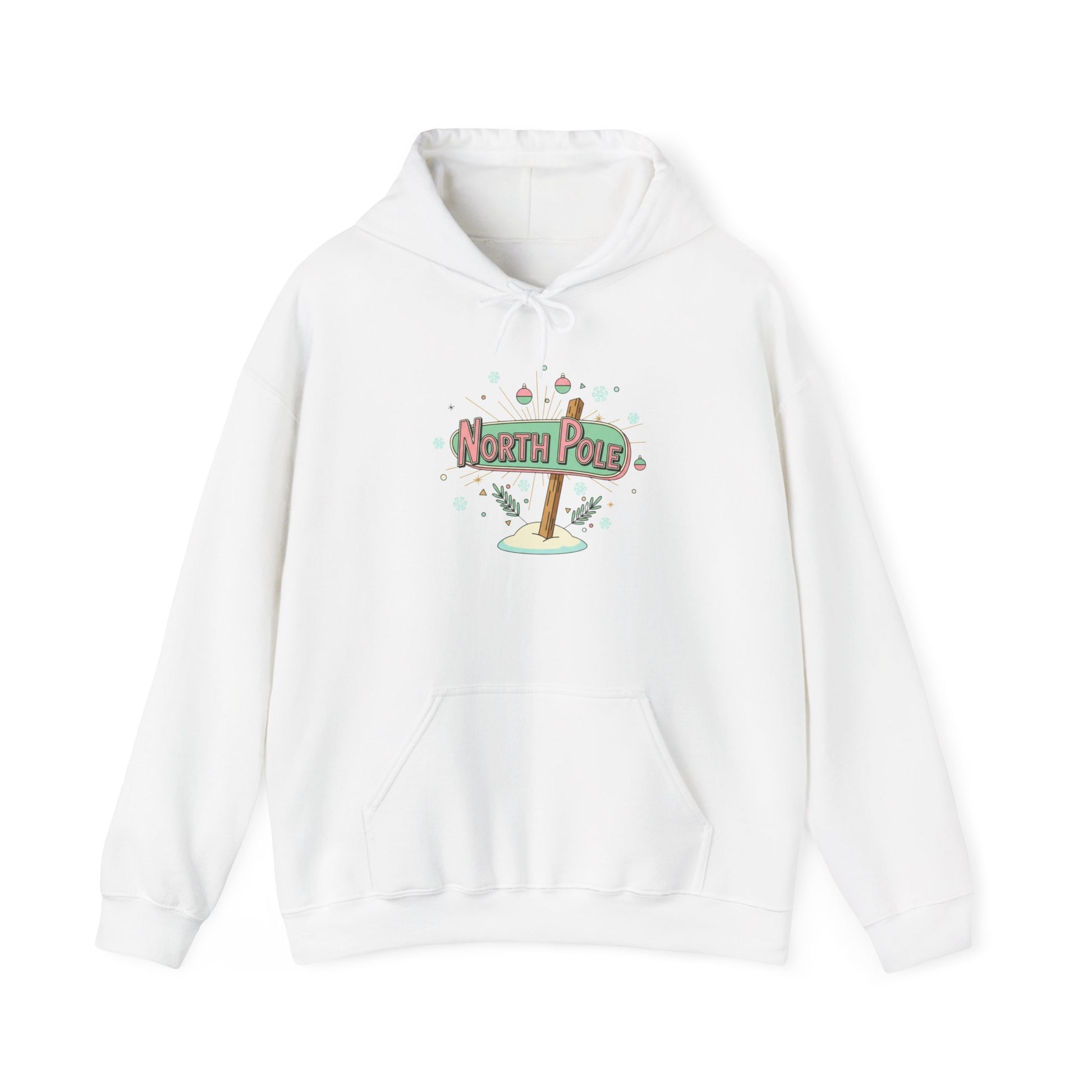 Imagine stepping into a softly lit winter evening: the air carries the faint scent of cedar and the hush of fresh snow. This mid-century North Pole sign, rendered in warm retro tones, feels like a page torn from holiday postcards. Slip this hoodie on, and you’re wrapped in a quiet, nostalgic glow, holiday markets, slow drives past decorated storefronts, or cosy nights stringing lights. The design speaks to folks who collect seasonal moments and love vintage graphics: subtle, tactile, and quietly festive for December gatherings and low-key family nights. It wears like a familiar memory, comfortable, reliable, and slightly playful without shouting for attention.